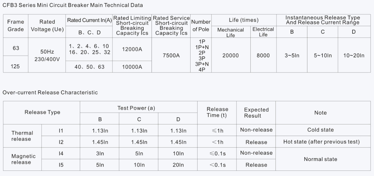 Миниатюрный выключатель серии CFB3-63/125 подходит для перегрузки и защиты короткого замыкания в цепях с номинальным напряжением 230 В/400 В и номинальным током 125A при частоте 50/60 Гц на тысячу переменных и также может использоваться для непрерывных операций с цепи при нормальных условиях.